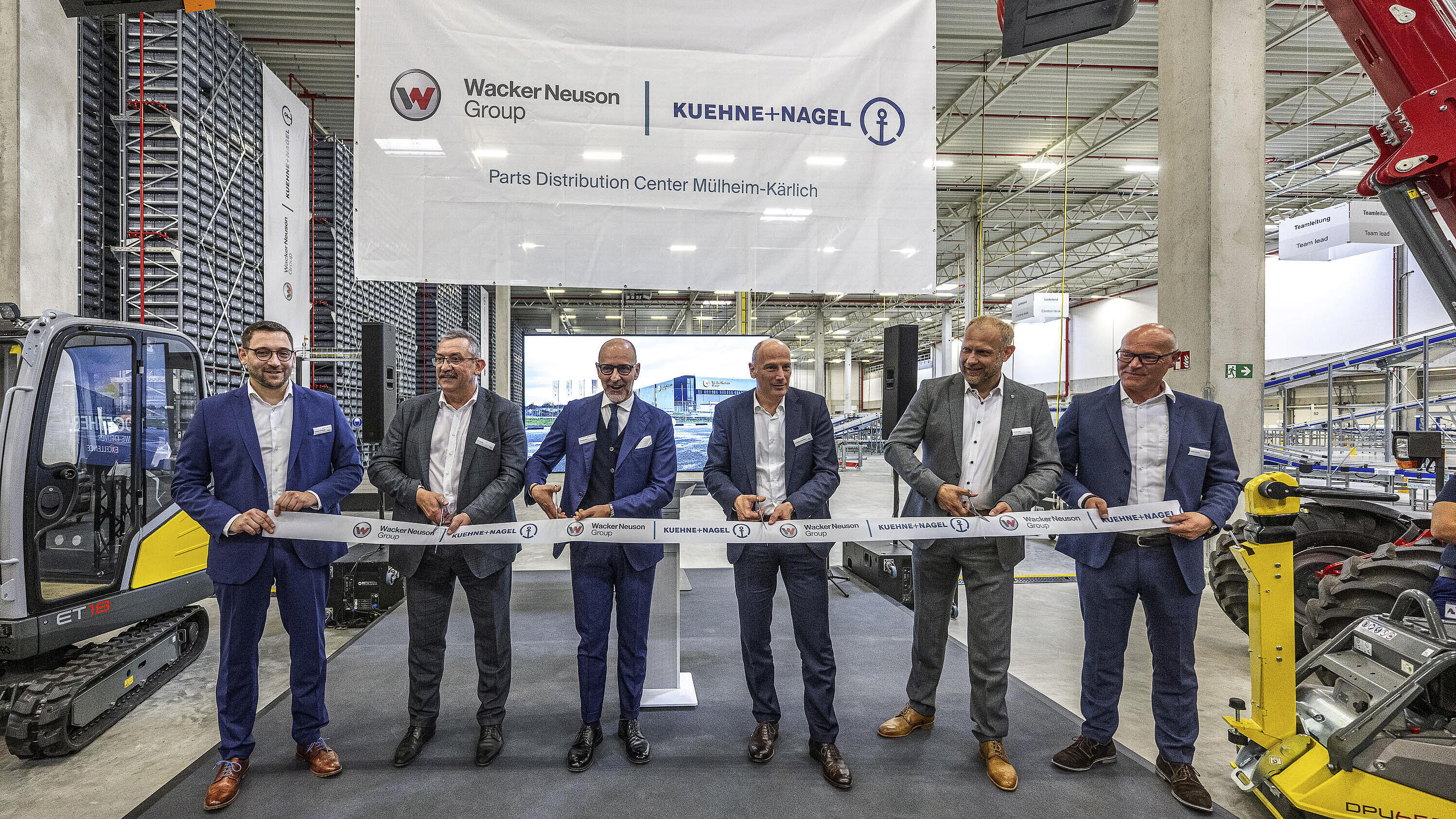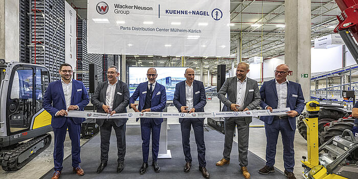 Bild der Eröffnung, Personen v.l.n.r.: Christoph Holzberger, Contract Logistics Site Manager, Kühne+Nagel (AG & Co.) KG; Axel Krichel, Mitglied der Geschäftsleitung, Kühne+Nagel (AG & Co.) KG; Gianfranco Sgro, Executive Vice President Contract Logistics Management Board, Kühne+Nagel (AG & Co.) KG; Alexander Greschner, Chief Sales Officer, Wacker Neuson Group; Andrew Voigt, Managing Director Corporate Aftermarket, Wacker Neuson Aftermarket & Services GmbH; Steffen Streubel, Head of Parts Operations, Wacker Neuson Aftermarket & Services GmbH.